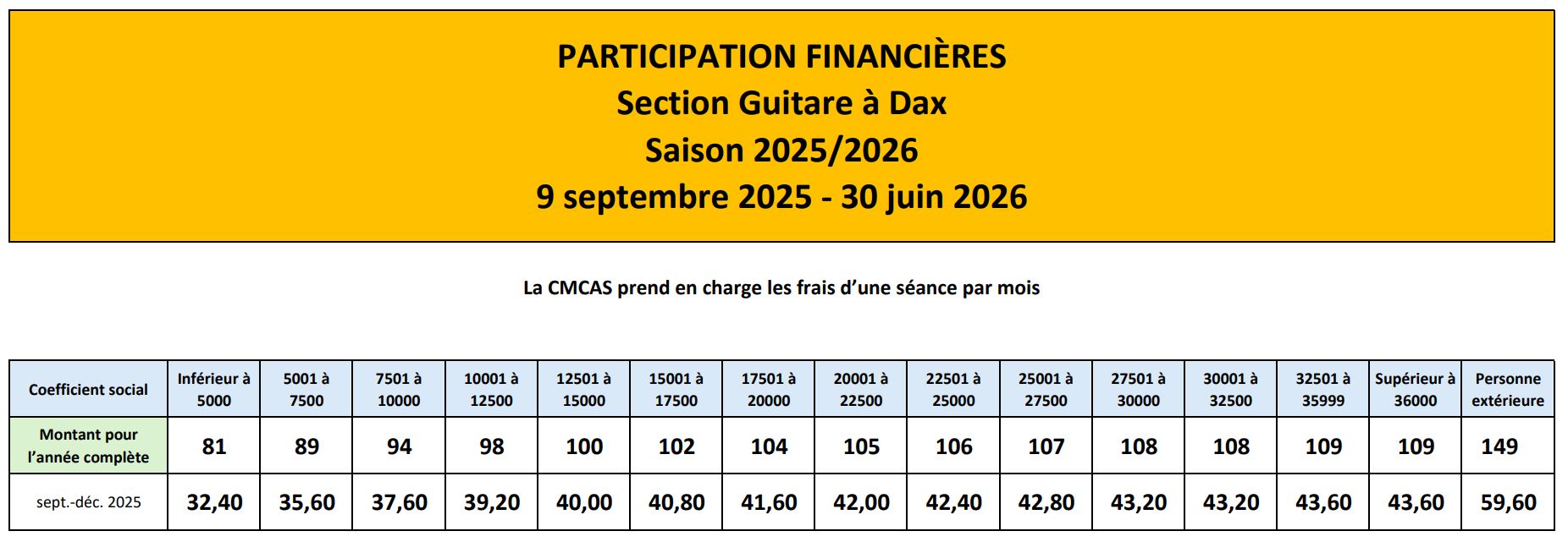 La plupart des séances seront assurées par Gaëtan, le professeur de guitare, et une fois par mois par Alain, un agent retraité passionné et expérimenté, responsable de la section guitare à Anglet depuis de nombreuses années. Chaque jeudi, il enchante le restaurant du Centre Vacances CCAS d’Anglet par ses animations musicales et partage régulièrement son talent lors d’événements marquants de la CMCAS (Fête de la CMCAS, repas de fin d’année à Morcenx, etc.).