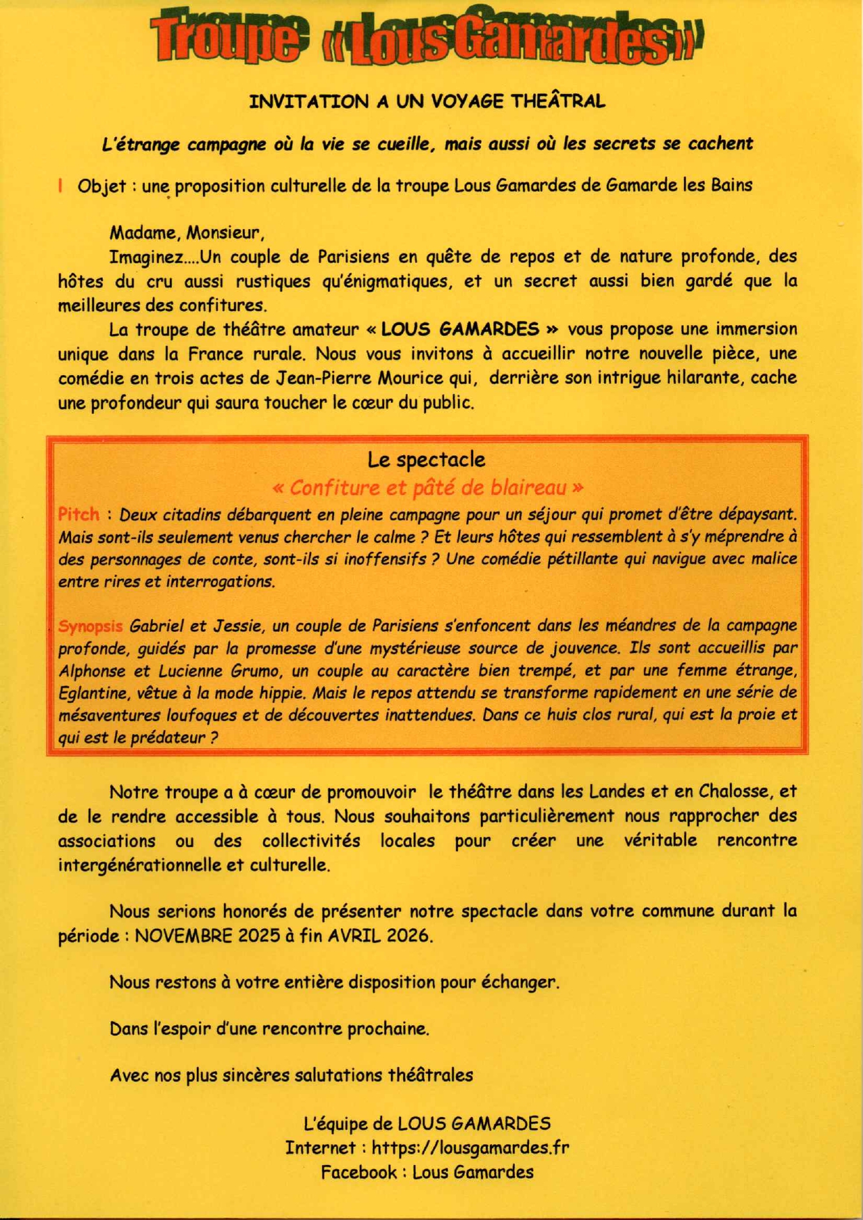 Nous vous donnons rendez-vous le jeudi 5 février 2026 à 14h30 au Centre Jean Jaurès – Salle Henri Scognamiglio, Place Léo Bouyssou à Morcenx-la-Nouvelle, pour partager un moment chaleureux autour de la galette des Rois, accompagnée de boissons pétillantes pour trinquer ensemble. Cette année, l’après-midi sera enrichie par une animation théâtrale avec la troupe Théâtre Lous Gamardes, qui vous présentera le spectacle : « Confiture et pâté de blaireau »
