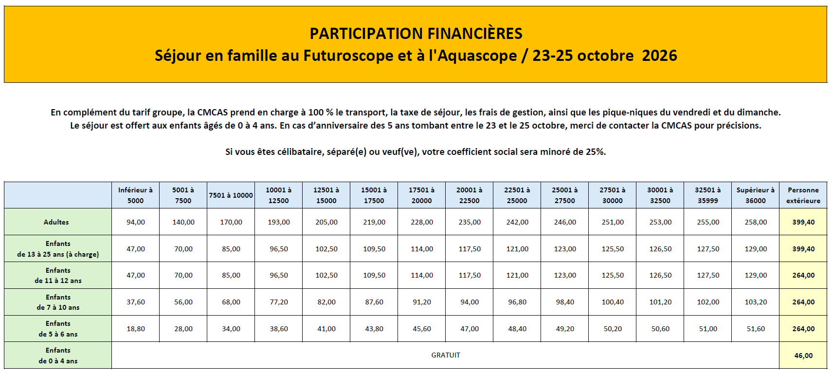 - Le séjour est offert aux enfants âgés de 0 à 4 ans. Lors de l’inscription, le tarif appliqué est déterminé en fonction de l’âge de votre enfant au premier jour du séjour. En cas d’anniversaire des 5 ans intervenant entre le 23 et le 25 octobre, merci de contacter la CMCAS pour toute précision.